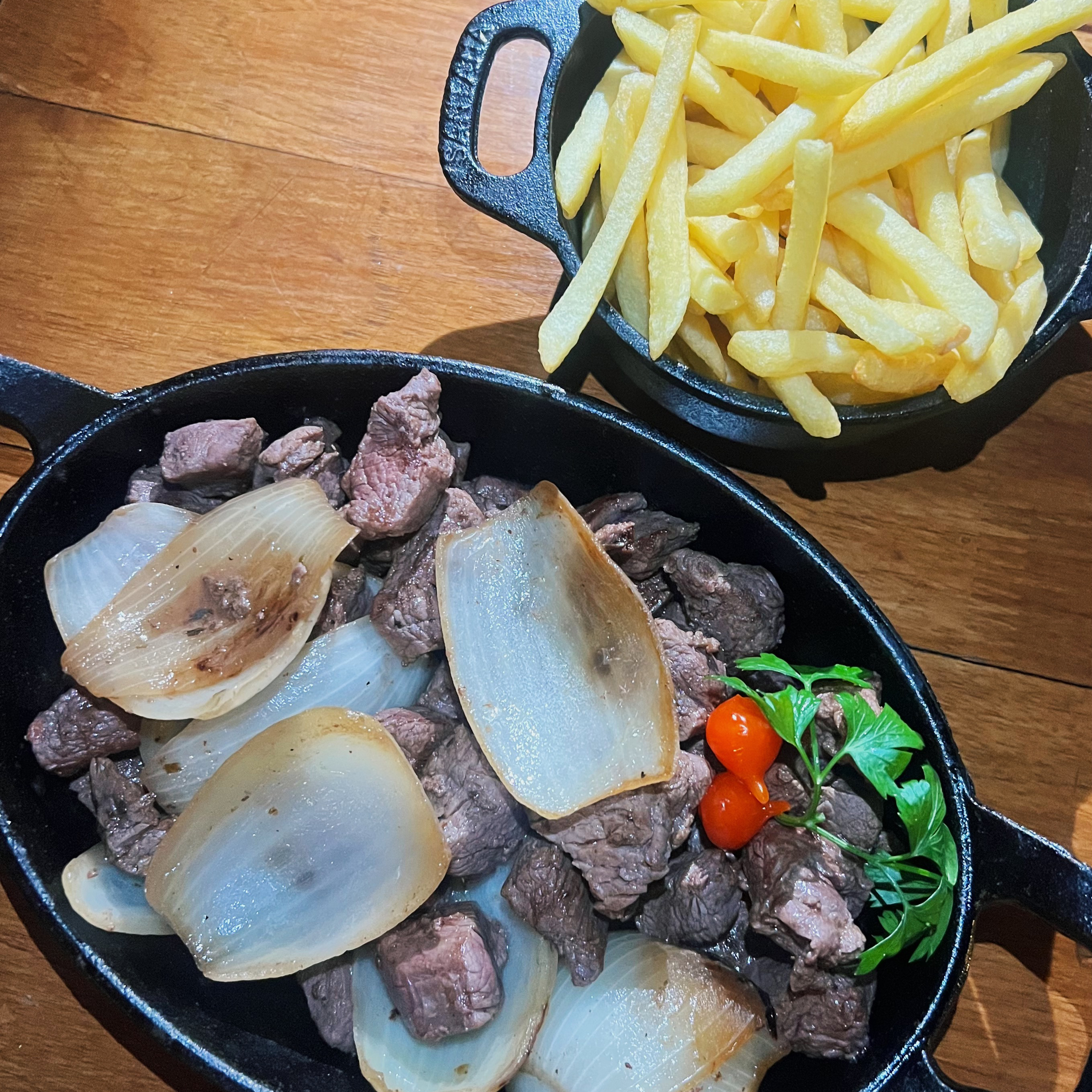 Cuts of filet mignon, onions and fries).
