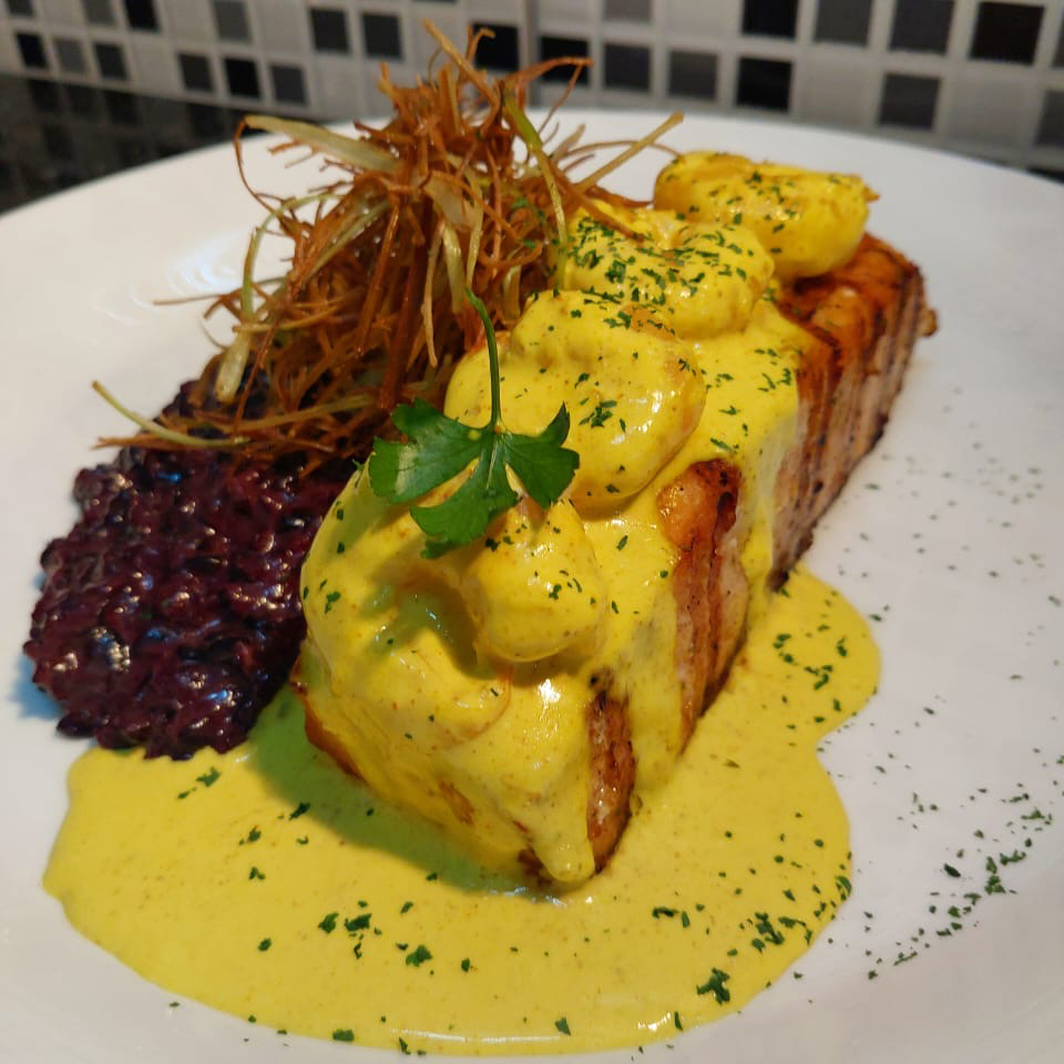 Crispyd fish filet served on a bed of banana mouseline.