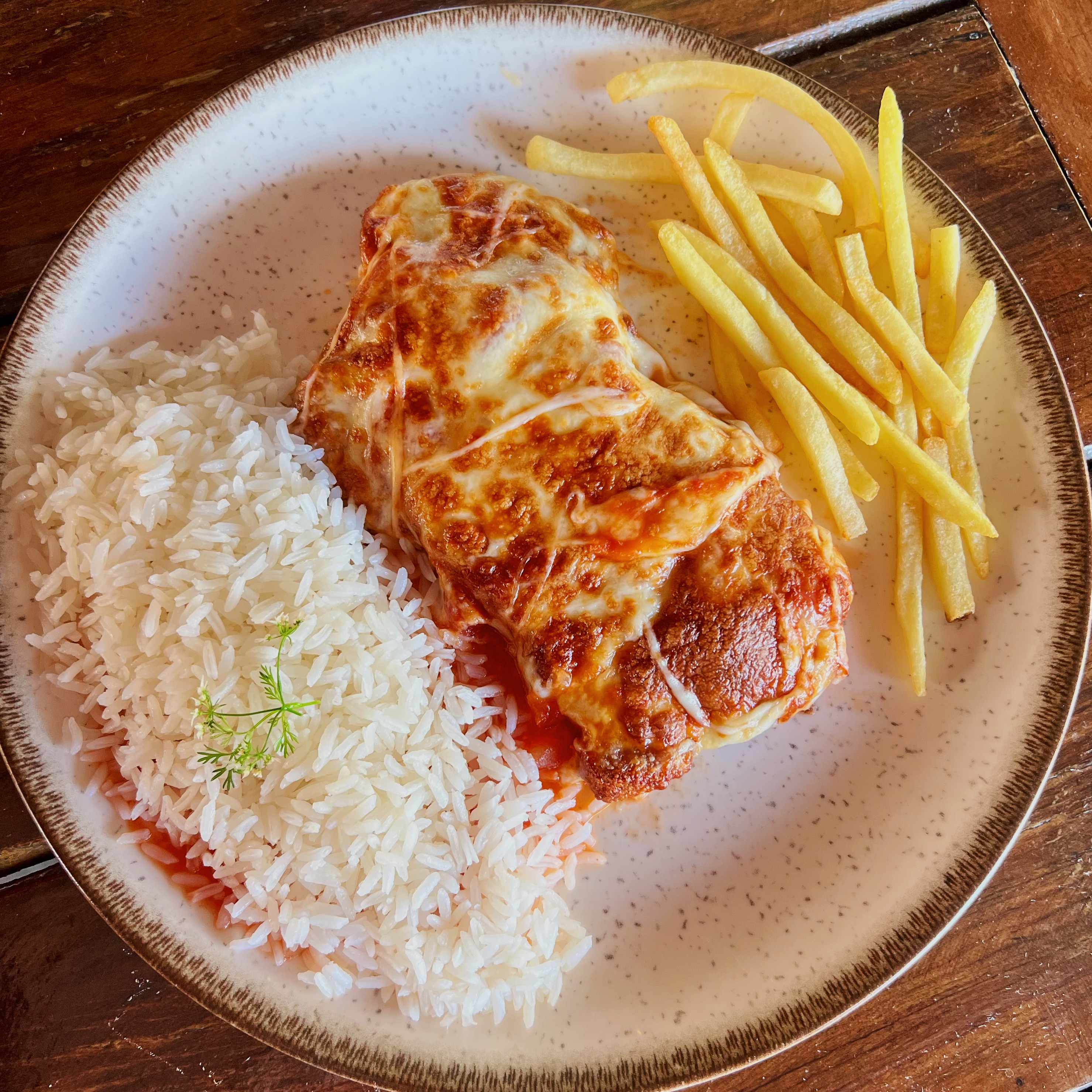 Filé mignon à parmegiana coberto com molho pomodoro e gratinado, servido com arroz branco e fritas.